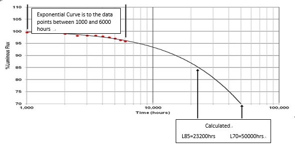 Los factores clave que influyen en la vida útil de la luminaria LED son los condensadores electrolíticos que utiliza la fuente de luz y el controlador, que están directamente relacionados con la temperatura. La vida útil especificada para las unidades de iluminación actuales en el mercado es tan baja como 15.000 horas y tan alta como 50.000 horas. Según los datos proporcionados por el principal proveedor de LED, según la prueba LM-80 o TM-21, la vida útil promedio del LED de alta potencia general es de 50.000 horas aproximadamente (el diagrama a continuación es de Cree). La vida útil del controlador LED depende de el nivel de producto y la temperatura de los condensadores electrolíticos; como práctica de diseño razonable, no se supone que sea inferior a la vida útil del LED.
