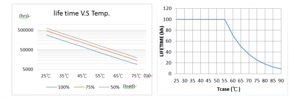 - Para la relación entre la vida útil y la carga, cuando la temperatura ambiente es de 55 ℃ y la carga funciona al 100%, la vida útil es de aproximadamente 35 Khrs; sin embargo, si la carga se reduce al 75%, la vida útil puede ser 1,6 veces mayor.