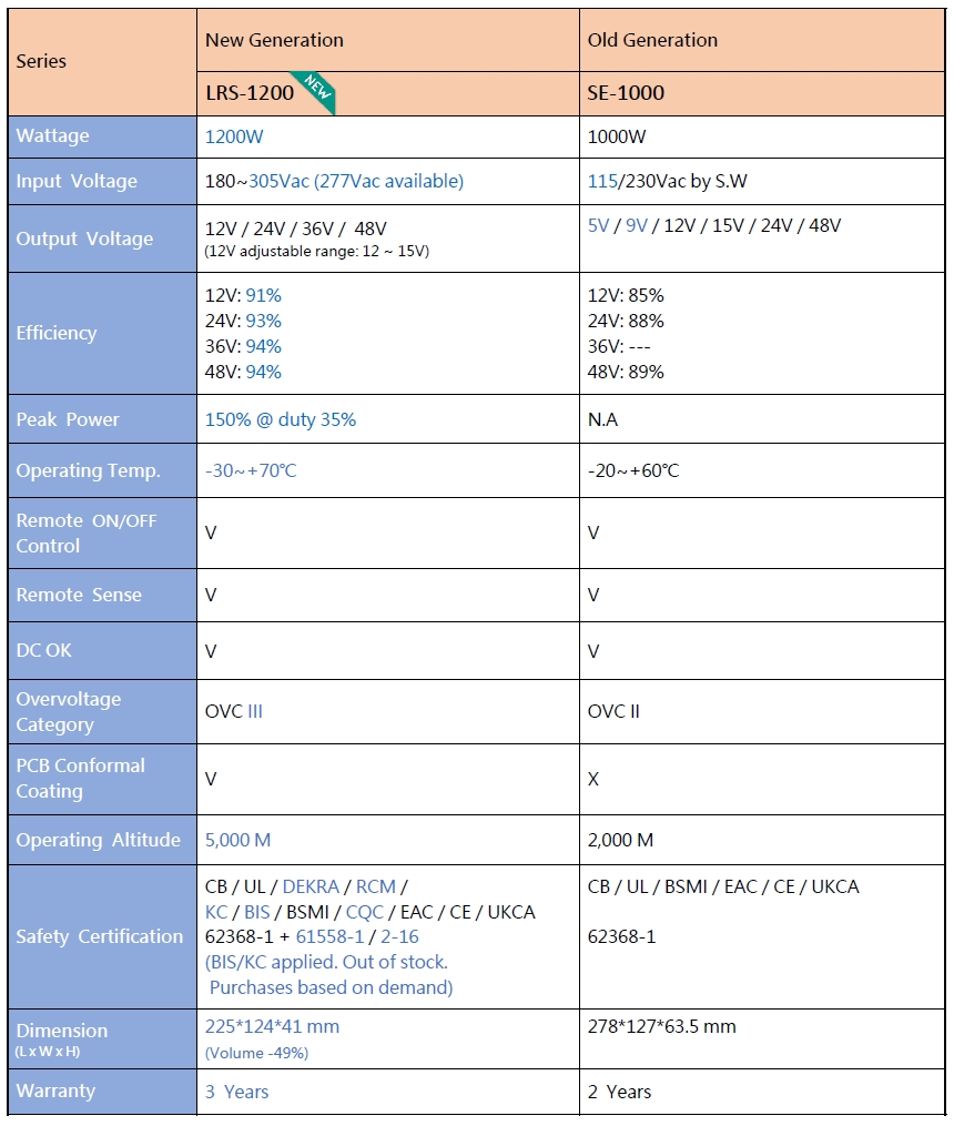 La serie LRS-1200 presenta importantes mejoras en tamaño, eficiencia, especificaciones, seguridad, durabilidad y valor general, lo que la convierte en un reemplazo de alto rendimiento y rentable para la serie SE-1000. En la siguiente tabla se ofrece una comparación detallada entre los modelos nuevos y antiguos: