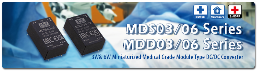 Después del lanzamiento de las series de convertidores DC/DC de grado médico MDS01/02, MDD/01/02 y MDD15/20, MEAN WELL lanza ahora la nueva serie MDS03/06 de salida única de 3W/6W y la serie MDD03/06 de salida dual. Las características clave de estas cuatro nuevas series incluyen: tamaño en miniatura de 1,25” x 0,8”, rango de entrada ultra amplio 4:1, temperatura de funcionamiento amplia de -40~+90 °C, corriente de fuga baja <5 μA y conformidad con 2× Aislamiento reforzado MOPP/4KVac/6KVdc. Con la certificación estándar de seguridad médica IEC60601-1, el MDS03/06 y el MDD03/06 son adecuados para mejorar el nivel de aislamiento del sistema médico y reducir la corriente de fuga de contacto del paciente para aplicaciones como unidad electro quirúrgica, monitor de oxígeno, estación móvil clínica, pantalla de quirófano, y equipo de cuidado bucal.