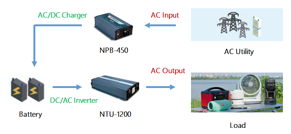 MEAN WELL presenta la serie NPB de cargadores inteligentes y la serie NTS/NTU de inversores de alta eficiencia , que se pueden utilizar con sistemas de batería del lado del usuario. Estos productos no solo resuelven problemas de suministro de energía en varios sitios sin suministro de corriente alterna, sino que también sirven como fuentes de alimentación de respaldo UPS basadas en baterías, lo que mejora la estabilidad del funcionamiento general del sistema. La siguiente figura muestra una configuración básica de una aplicación de almacenamiento de energía móvil.