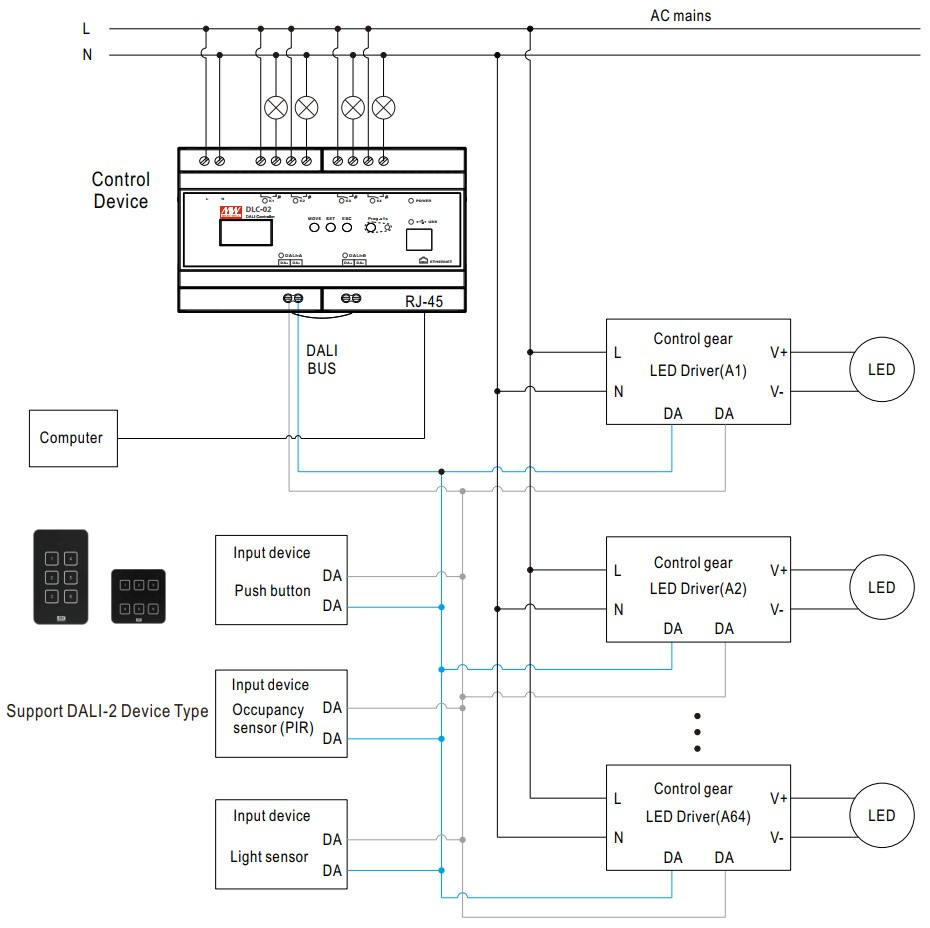 El panel táctil de la serie DTP-2XX se puede utilizar con el controlador principal DALI-2 de MEAN WELL (DLC-02) para construir un sistema de iluminación inteligente DALI-2 completo, logrando un control de iluminación más integral e inteligente.